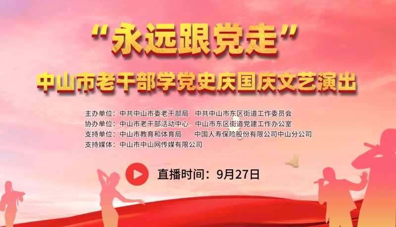 為深入學習貫徹習近平總書記“七一”重要講話精神,深化黨史學習教育成果,慶祝中華人民共和國成立72周年,展示新時代老干部的精神風貌。市委老干部局和東區街道黨工委聯合主辦的“永遠跟黨走”中山市老干部學黨史慶國慶文藝演出于9月27日舉行,中山網將全程直播,敬請關注。