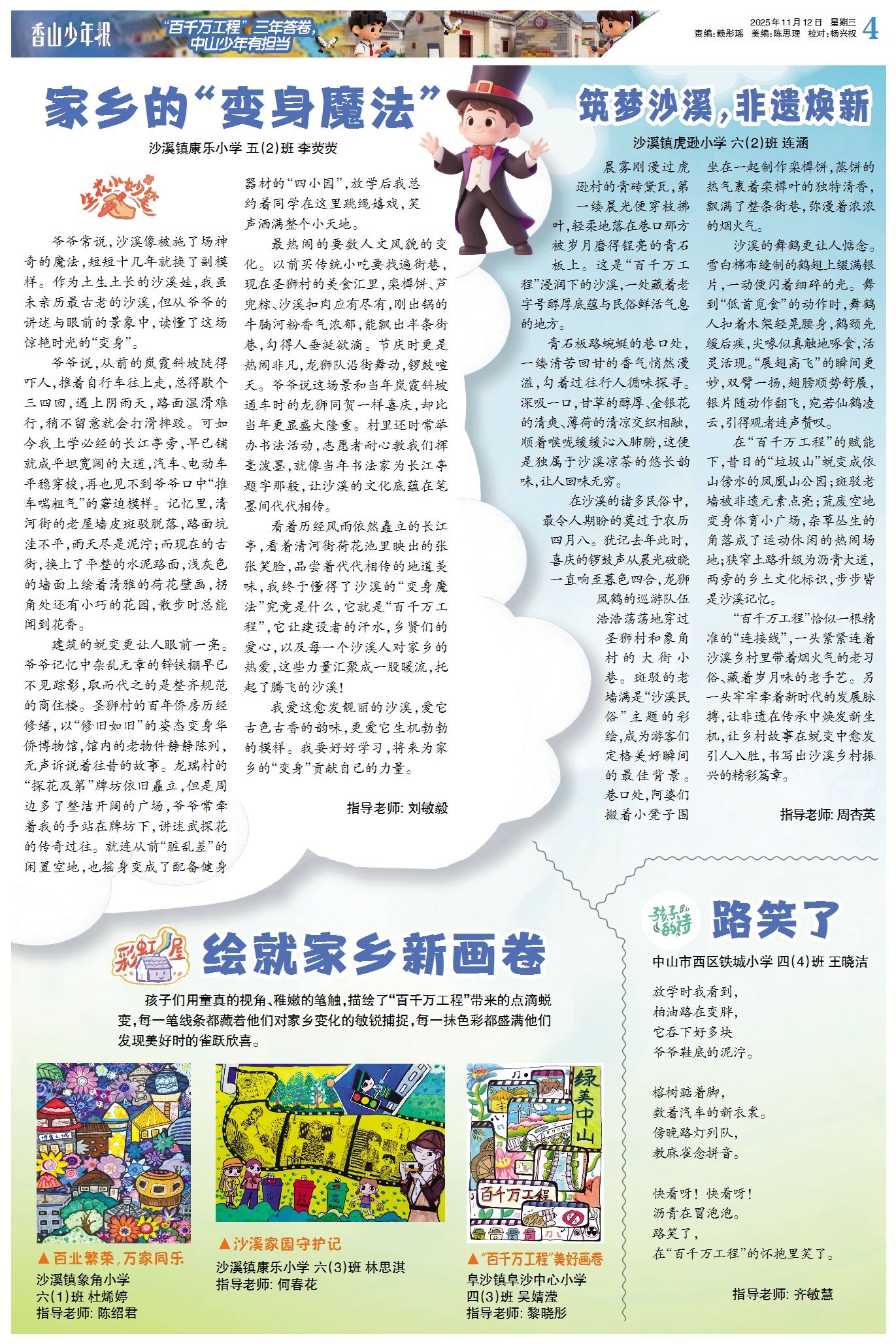 為了讓青少年了解并參與到“百千萬工程”中,中山精心搭建實踐平臺,開展了“萬名香山少年探訪中山百千萬工程”大型采風研學實踐活動、香山少年報校園通訊站(沙溪)助力“百千萬工程”活動。這些精心策劃的活動,以采風研學、創作分享等形式,帶動青少年及家庭深度融入城市發展,讓青春力量為中山城鄉蝶變添彩。→點擊查看詳情