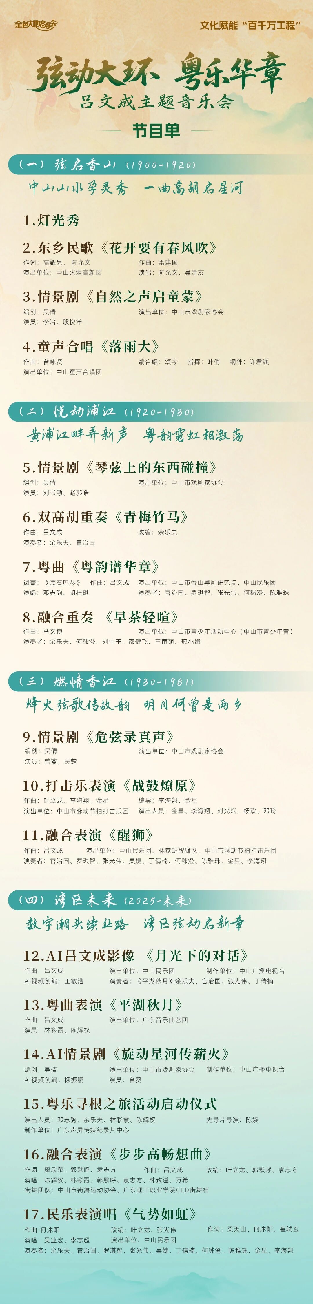 音樂會不僅集結(jié)中山市戲劇家協(xié)會、中山民樂團、中山童聲合唱團、東鄉(xiāng)民歌非遺傳承人林家班醒獅等本土藝術(shù)力量,當(dāng)代杰出高胡演奏家余樂夫,粵劇名家鄧志駒,詞曲作家、歌手陳輝權(quán),廣東音樂曲藝團青年歌唱家林彩霞也將傾情參演。