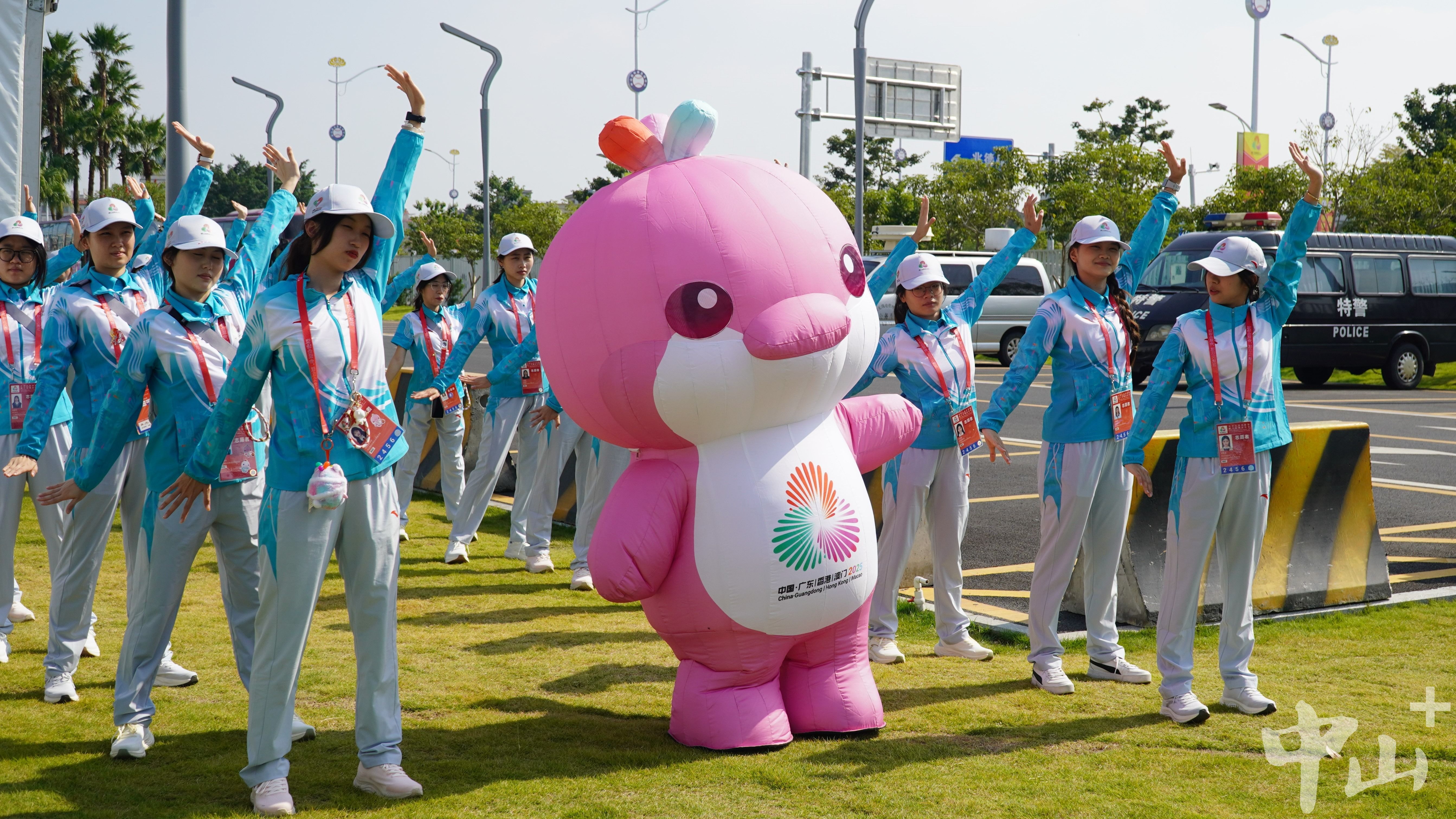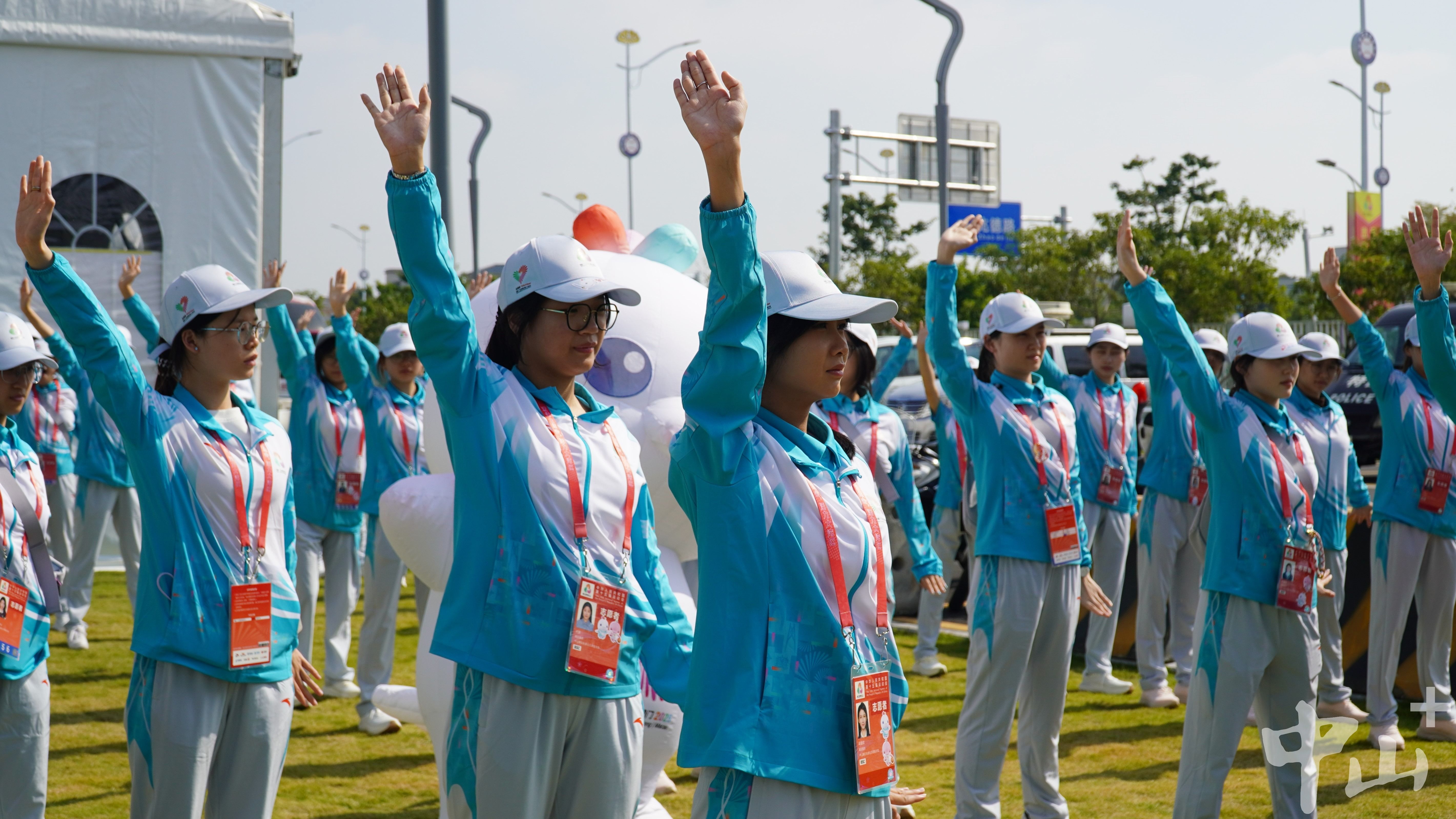 活動在中山國際棒壘球中心“志愿者之家”門口的草坪上進行,現場氛圍熱烈歡快。來自廣東理工職業學院、電子科技大學中山學院等高校的志愿者身著統一碧青綠志愿服裝,整齊列隊。十五運會的吉祥物“喜洋洋”“樂融融”也來到現場,為活動增加不少活力。