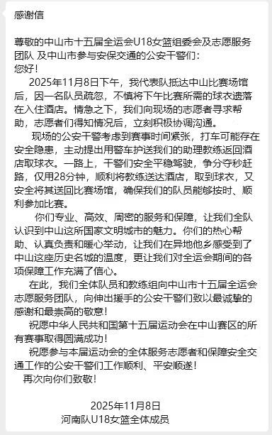 11月13日晚,十五運會籃球項目女子18歲以下組比賽落下帷幕。11月14日中午,十五運中山賽區(qū)執(zhí)委會在代表隊下榻的中山喜來登酒店歡送各省代表隊踏上回程。中山賽區(qū)執(zhí)委會志愿服務(wù)部的兩名志愿者也來到了現(xiàn)場。此前,她們和參與比賽安保交通的公安民警收到了一封來自河南隊U18女籃全體成員的感謝信。