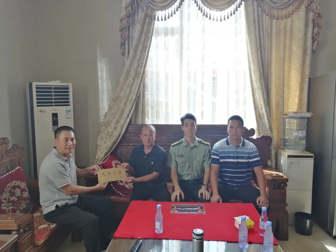 為進(jìn)一步鞏固和發(fā)展軍政軍民團(tuán)結(jié),弘揚(yáng)新時(shí)代擁軍優(yōu)屬的優(yōu)良傳統(tǒng),推進(jìn)軍人榮譽(yù)體系建設(shè),營(yíng)造關(guān)愛軍人的濃厚社會(huì)氛圍,7月15日上午,阜沙鎮(zhèn)武裝部、退役軍人服務(wù)中心聯(lián)合走訪今年入伍的6名新兵家屬,為其家庭懸掛“光榮之家”門牌,送上入伍電子相冊(cè),了解新兵在部隊(duì)的訓(xùn)練、學(xué)習(xí)和生活情況,增強(qiáng)軍屬家庭的榮譽(yù)感和自豪感,讓他們切實(shí)感受到黨和政府的關(guān)愛和溫暖。 在新兵周志偉家中,其父親周錦元自豪地說(shuō):“雖然非常舍不得志偉離開我們,但是送他到部隊(duì)鍛煉,為國(guó)家作貢獻(xiàn),心里還是很高興的,也非常自豪。今天你們來(lái)給我家掛光榮牌、送相冊(cè),我們?nèi)倚睦锱?,非常感謝黨和政府對(duì)我們的關(guān)心?!?/p>一人參軍,全家光榮 一塊刻著“光榮之家”的小小牌匾 對(duì)軍屬家庭來(lái)說(shuō)卻是一份特殊的“禮物” 牌匾雖小