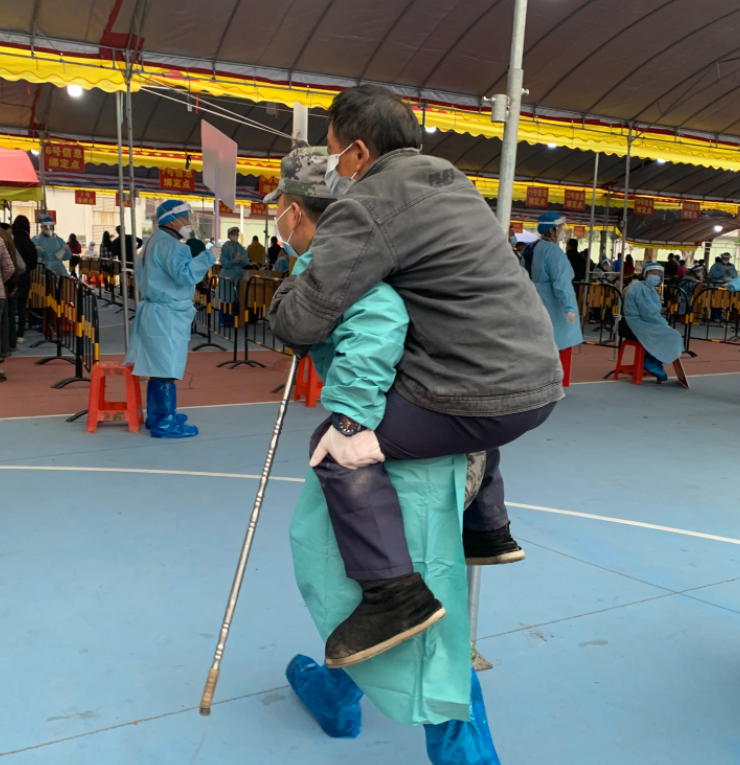在小欖鎮聯豐社區核酸檢測采樣現場,退役軍人吳鴻文背起一位行動不便的老人前往核酸采樣工作臺,采樣結束后,將老人送出場外。臨走的時候老人連聲向他道謝。 此外,民眾街道退役軍人服務中心動員紅旗志愿服務隊退役軍人志愿者分別前往該街道18個免費便民核酸采樣點,助力街道開展核酸檢測工作。 |