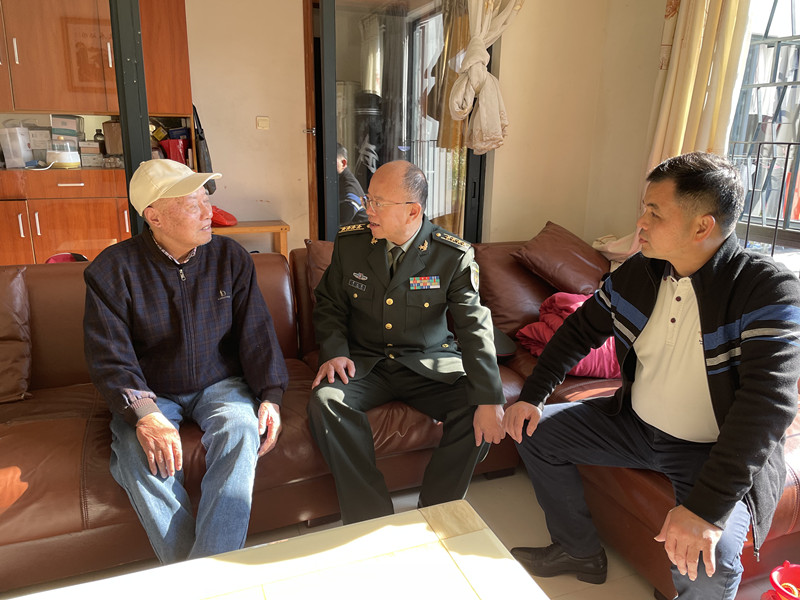 迎新春,送溫暖。1月19日,中山軍分區、中山市退役軍人事務局到南區街道聯合開展2023年春節走訪慰問活動,慰問因公十級殘疾軍人和現役軍人家屬,向他們致以新春的問候和美好祝愿。中山軍分區大校司令員李云濤參加慰問。 李云濤一行先后來到現役軍人家屬曹軍民和因公十級殘疾軍人胡華銀的家中,為他們送去慰問金和大米、食用油、面條、春聯等慰問品,并送去新年的祝福和關懷。 在現役軍人曹秦的家中,李云濤感謝其家人為部隊輸送了優秀人才,為國防建設作出了突出貢獻。據了解,曹軍民的兒子曹秦于2022年9月入伍,服役于新疆烏魯木齊武警總隊。曹軍民表示,非常感謝黨和政府對現役軍人家庭的關心,把孩子交給部隊很放心。  ▲李云濤一行慰問84歲高齡的老兵胡華銀(左一)。 記者 張倩 攝