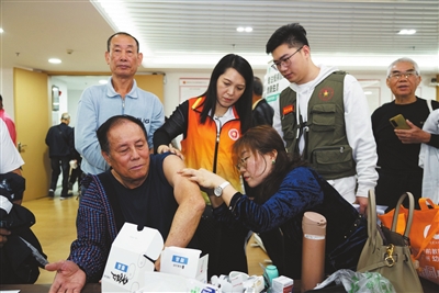 工作人員、志愿者協助退役軍人測血糖。本報記者 黃藝杰 攝