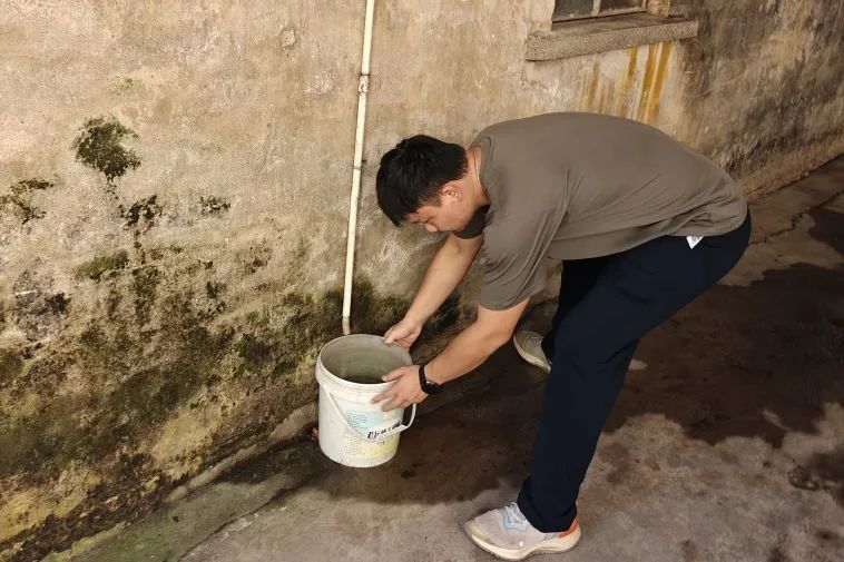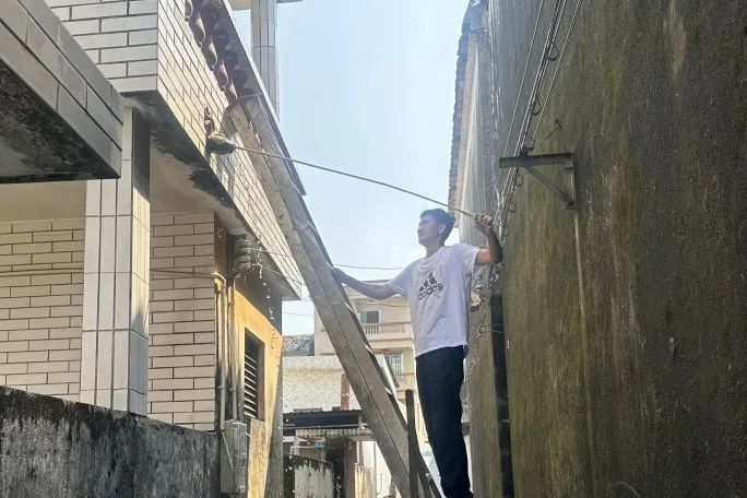 “阿姨,您家樓頂積了水,容易孳生蚊蟲,得趕緊清掉。我們現在先幫您疏通一下排水口。” 在南朗街道蚊媒傳染病防控一線,左步村網格員、退伍軍人嚴兆雄跟村民溝通后,爬上長梯,用工具疏通天臺外墻排水口,讓積水迅速排走,從源頭阻斷蚊蟲孳生。