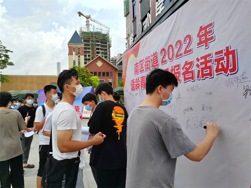 體檢現場,南區街道嚴格按照標準設置,通過懸掛征兵標語、張貼海報、使用LED屏播放征兵宣傳片等方式,營造濃厚氛圍。事前,南區街道征兵辦嚴格落實常態化疫情防控要求,提前收集、核查好參檢青年的粵康碼、行程卡、核酸檢測證明等,并對體檢場所進行全面消毒處理,保持體檢站分離通風。參檢人員全程佩戴口罩,分批分流進行體檢,確保體檢工作平穩有序開展。  ▲適齡青年參加體檢簽名