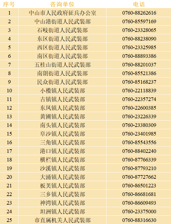2025年全國征兵(男兵)應(yīng)征報(bào)名已于12月1日開始。記者從中山市人民政府征兵辦公室獲悉,即日起,符合條件的青年可通過官方渠道報(bào)名參軍,對于征兵政策和流程存有疑問的市民,可通過撥打各鎮(zhèn)街征兵咨詢電話獲得詳細(xì)解答。 應(yīng)征報(bào)名(男兵) 應(yīng)征報(bào)名提示:男兵報(bào)名前須完成兵役登記 全國征兵(男兵)2025年應(yīng)征報(bào)名時(shí)間 上半年應(yīng)征報(bào)名:2024年12月1日至2025年2月10日24時(shí) 下半年應(yīng)征報(bào)名:2024年12月1日至2025年8月10日24時(shí) 男兵應(yīng)征報(bào)名對象 高中(含中專、職高、技校)畢業(yè)生及以上文化程度的青年(含高校在校生),年滿18至22周歲(2003年1月1日——2007年12月31日出生);普通高等學(xué)校本專科畢業(yè)生、上半年符合畢業(yè)條件的畢業(yè)班學(xué)生,年滿18至24周歲;研究生畢業(yè)生及在校生放寬至26周歲;初中畢業(yè)文化程度男青年,年滿18至20周歲。 應(yīng)征報(bào)名(女兵) 全國征兵(女兵)2025年應(yīng)征報(bào)名時(shí)間 上半年應(yīng)征報(bào)名:2025年1月1日至2025年2月10日24時(shí) 下半年應(yīng)征報(bào)名:2025年7月1日至2025年8月10日24時(shí) 女兵應(yīng)征報(bào)名對象 上半年應(yīng)征報(bào)名:普通高等學(xué)校和科研機(jī)構(gòu)全日制應(yīng)屆畢業(yè)生及在校生,年滿18至22周歲(2003年1月1日——2007年12月31日出生),全日制研究生應(yīng)屆畢業(yè)生及在校生放寬至26周歲;2024年普通高等學(xué)校全日制本專科應(yīng)屆畢業(yè)生可以報(bào)名參加2025年上半年女兵征集,年齡放寬至23周歲。 下半年應(yīng)征報(bào)名:普通高中應(yīng)屆畢業(yè)生、普通高等學(xué)校和科研機(jī)構(gòu)全日制應(yīng)屆畢業(yè)生及在校生,年滿18至22周歲(2003年1月1日——2007年12月31日出生),全日制研究生應(yīng)屆畢業(yè)生及在校生放寬至26周歲。 報(bào)名方式 報(bào)名方式征兵報(bào)名官方網(wǎng)站:全國征兵網(wǎng) www.gfbzb.gov.cn 軍隊(duì)媒體移動(dòng)旗艦客戶端:中國軍號App 中山各鎮(zhèn)街征兵咨詢電話