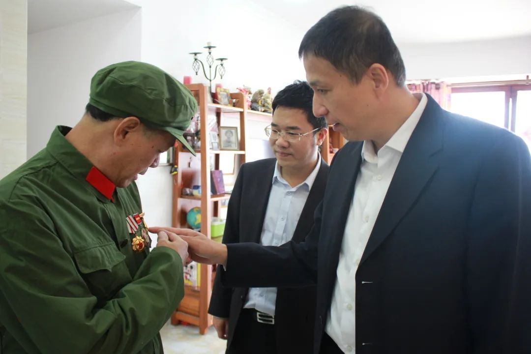 “身體現在怎么樣,有什么困難嗎?”走進徐綺基家中,周俊峰書記與他親切聊起家常,詳細了解其身體狀況和生活情況。基叔高興之余,穿起了軍裝,還戴上了勛章,向現場人員進行展示。