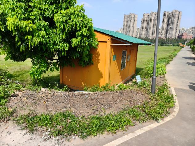 ▲悅生圍景區(qū)南入口停車場(chǎng)、集裝箱
