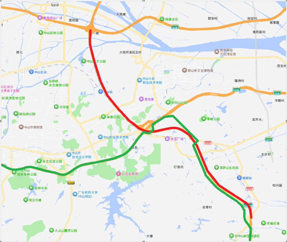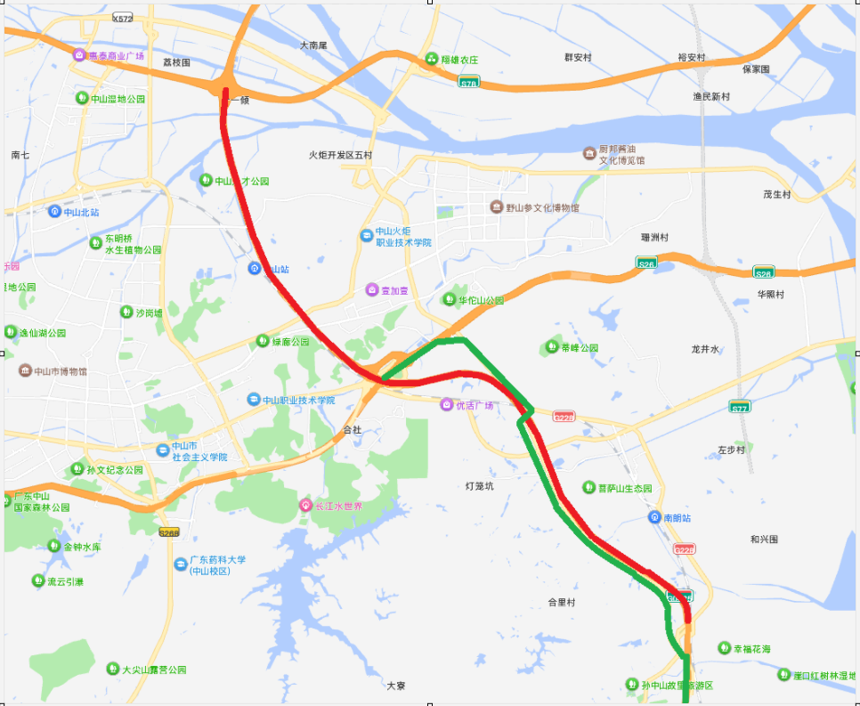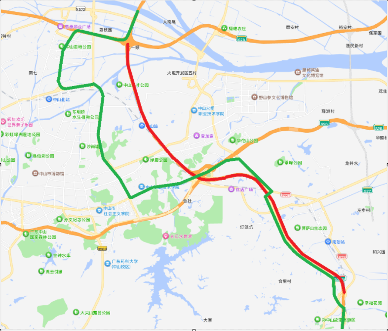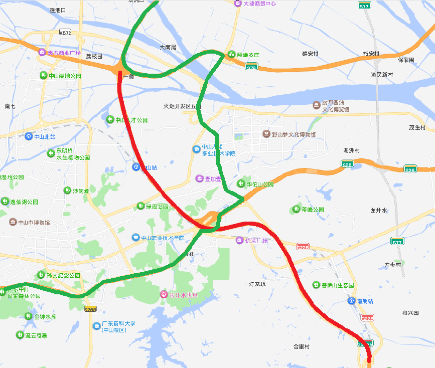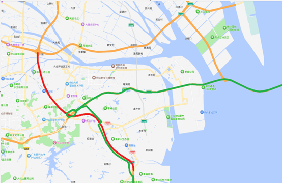 深岑高速→中開高速→轉城東收費站出→博愛七路→逸仙路→南朗快線→翠亨大道→翠亨收費站入。