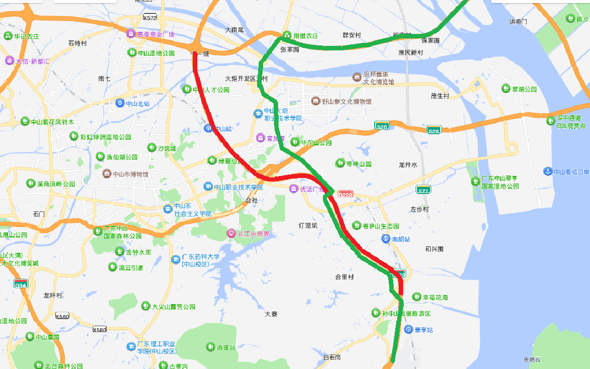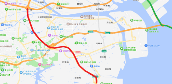翠亨收費站出→翠亨大道→南朗快線→南歧北路→逸仙路→G228國道→民眾南收費站→南中高速→轉廣澳高速。