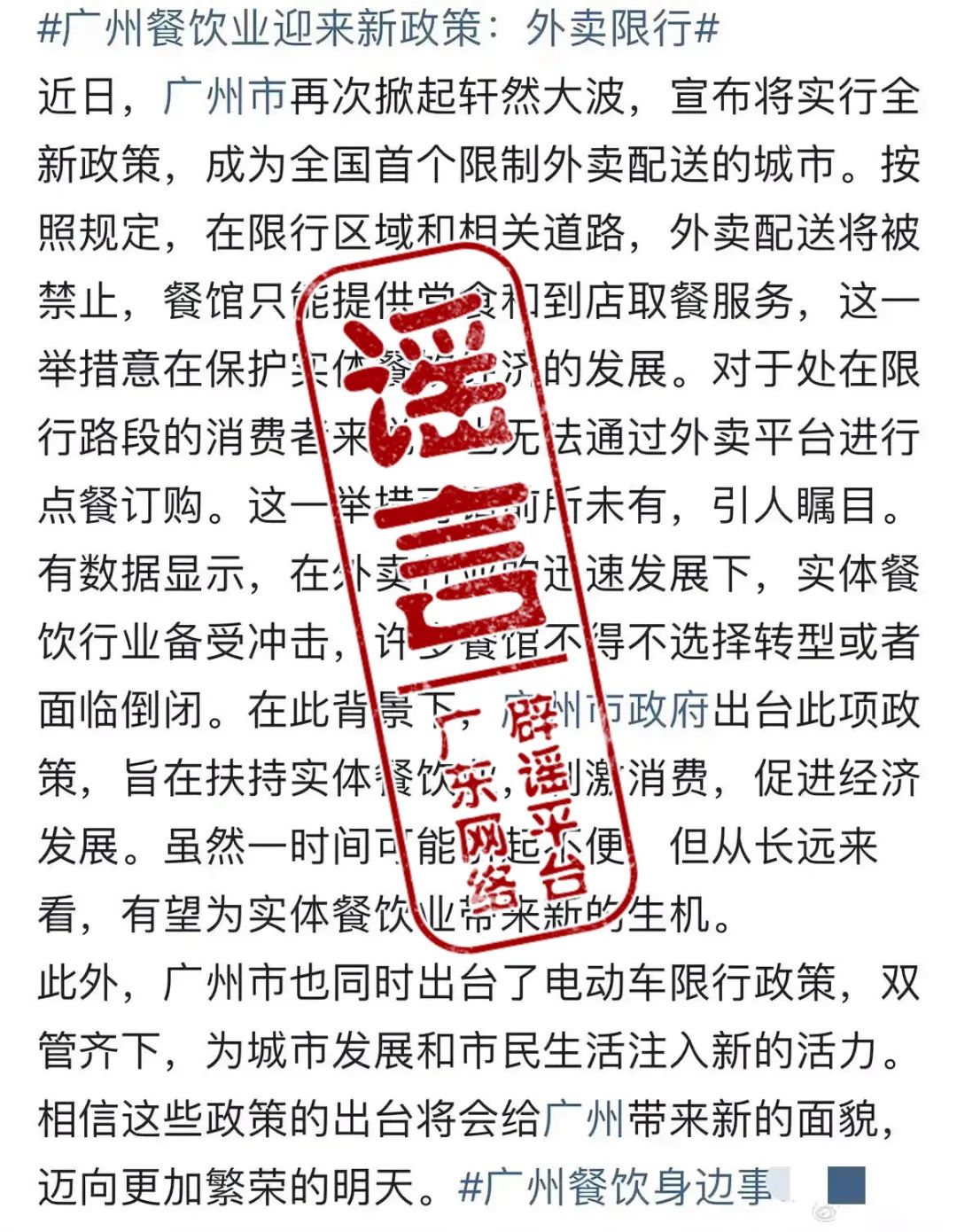 近日,有自媒體發布“廣州市將實行全新政策,成為全國首個限制外賣配送的城市”“限行區域和相關道路,外賣配送將被禁止,餐館只能提供堂食和到店取餐服務”,經核查,上述信息嚴重不實,惡意曲解廣州電動自行車限行新規,誤導民眾,引發不良社會影響。
