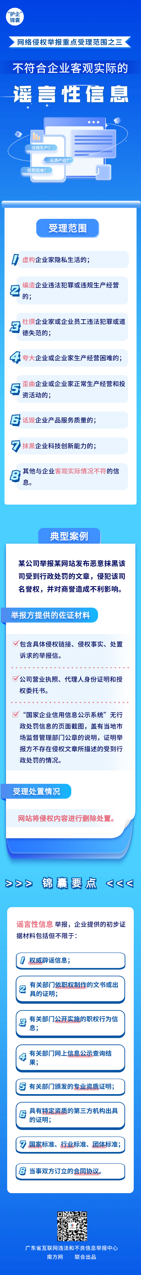 為有效助力企業維護自身網絡合法權益,廣東省互聯網違法和不良信息舉報中心精心準備了“護企”錦囊,結合案例帶大家了解涉企網絡侵權信息的重點受理范圍,今天推出重點受理范圍之三——不符合企業客觀實際的謠言性信息。