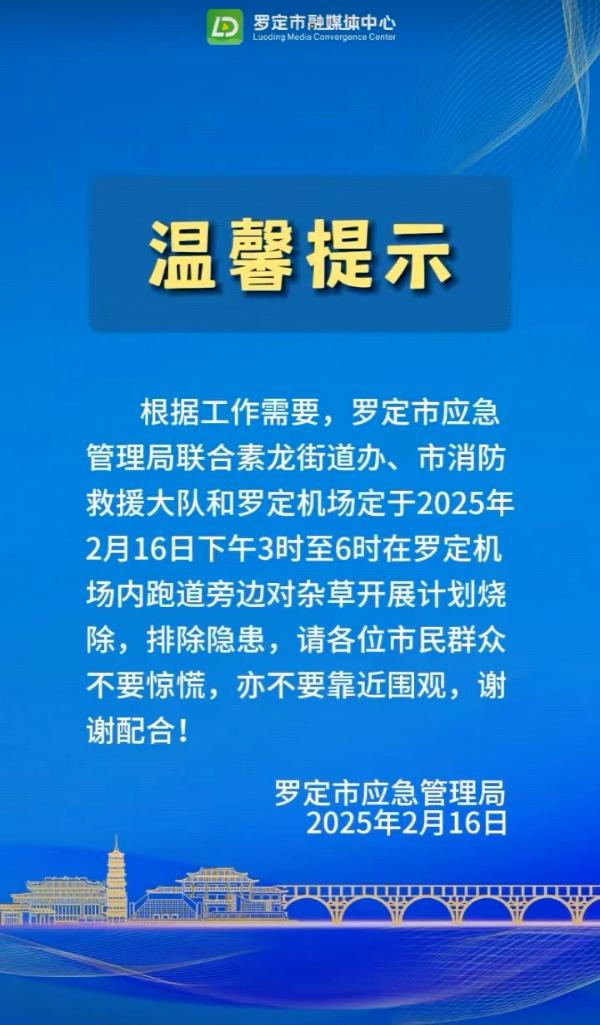 記者查詢發現,羅定市融媒體中心曾于2月16日發布一則提示,明確表示羅定機場將于2025年2月16日下午3時至6時,在跑道旁開展雜草燒除工作,并提醒市民不必驚慌。