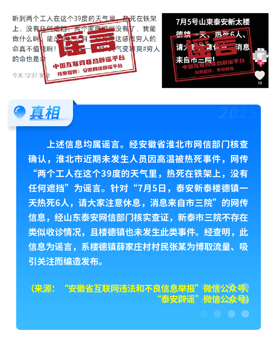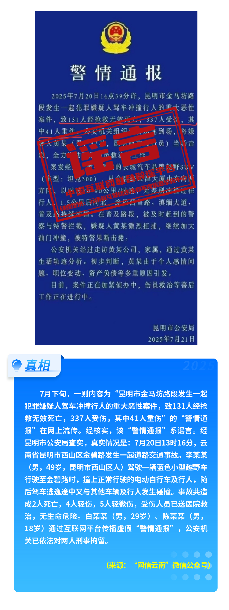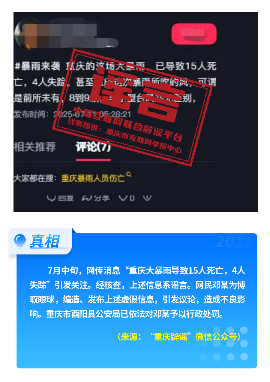 近期,網上接連出現發布虛假“警情通報”的惡性造謠傳謠案件,炮制傳播“昆明駕車撞人案131人死亡”“杭州自來水接入糞水”及涉釋永信虛假“警情通報”,模仿“藍底白字”格式,杜撰聳人聽聞細節,損害政府公信力,嚴重擾亂社會秩序。“院士預測廣東將發生8級以上大地震”公然偽造專家聊天截圖,謊報地震預警。還有造謠者借盛夏高溫酷暑與洪澇災害,編造“安徽淮北、山東泰安等地多人因高溫死亡” “重慶大暴雨導致15人死亡、4人失蹤”等謠言,蹭炒熱點、煽動情緒。