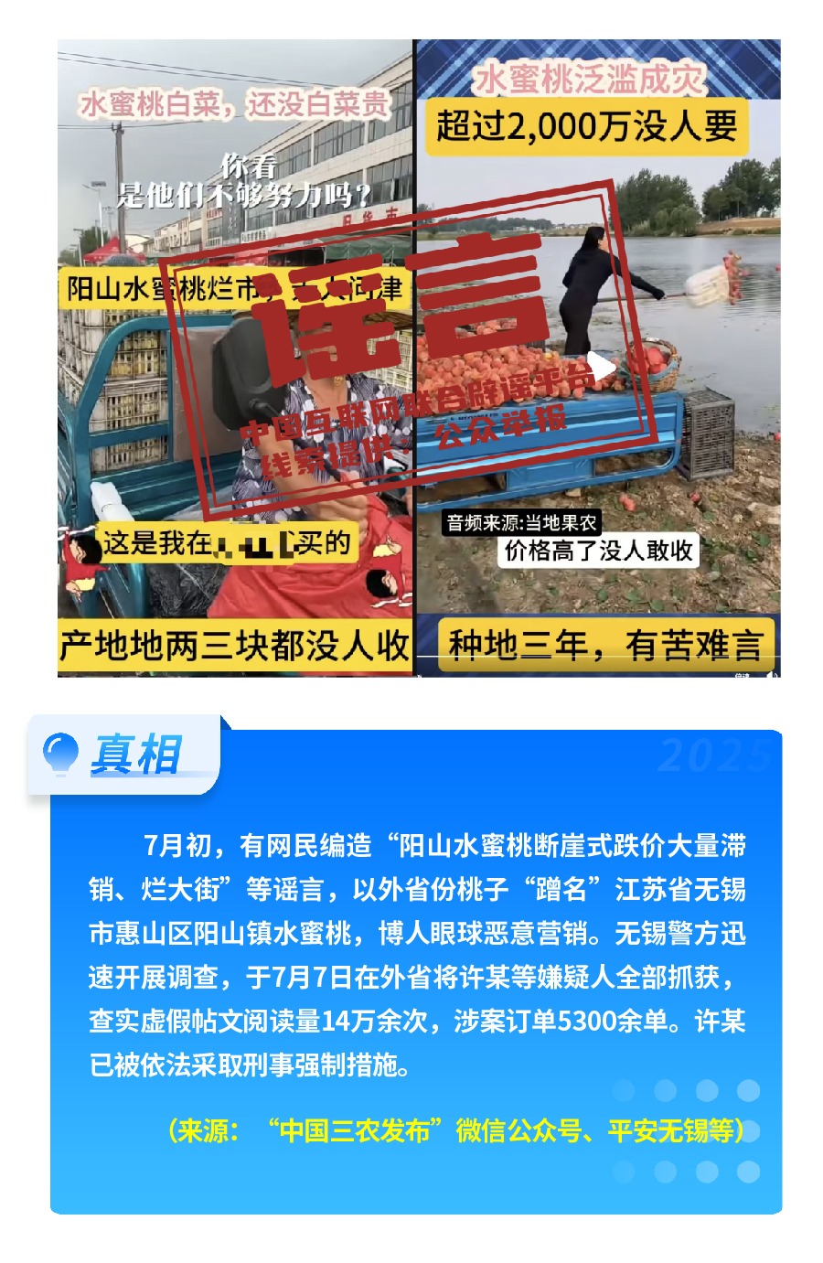 此外,7月份正值暑期旅游旺季和水果等農產品收獲季,有自媒體、商家借機編造傳播涉文旅及農產類謠言,干擾市場秩序,侵害消費者權益。有商家違規使用人民大會堂建筑圖片標識和名稱,仿冒人民大會堂賬號,非法售賣、倒賣參觀門票,損害游客權益。個別商家剪輯發布“江蘇無錫陽山水蜜桃斷崖式跌價、大量滯銷、爛大街”謠言視頻,再借機兜售假冒的陽山水蜜桃,博人眼球惡意營銷,擾亂市場秩序。所謂“峨眉山人猴大戰,游客墜崖,猴王被當場擊斃”景區安全事件一度傳得沸沸揚揚,相關視頻以驚悚情節博取關注,畫面實際是用AI合成拼接制作。
