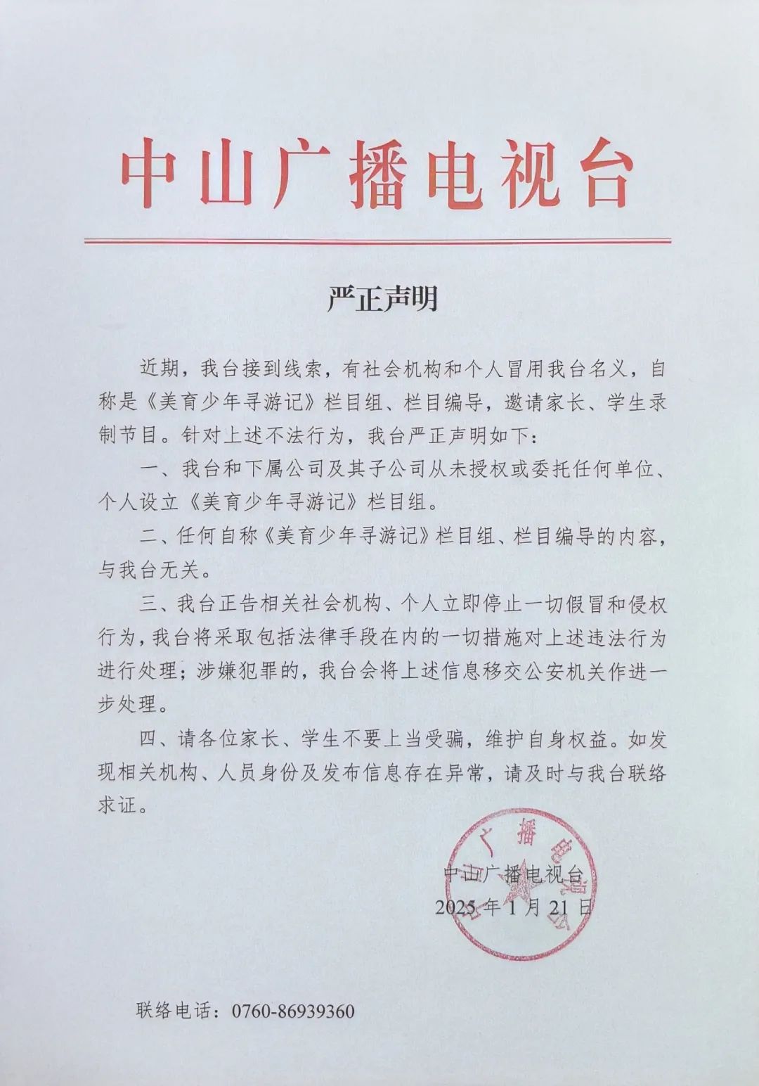 針對《美育少年尋游記》欄目組的不法行為,中山廣播電視臺在此發出嚴正聲明: