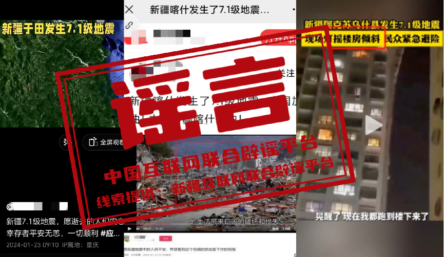 詳情:1月23日2時9分,新疆阿克蘇地區烏什縣發生7.1級地震。隨后,關于此次地震的各種不實信息在網絡上傳播,混淆視聽、引發關注。針對“新疆喀什發生7.1級地震”“新疆和田地區于田縣發生7.1級地震”的網傳信息,經喀什市應急管理局和于田縣應急管理局證實,1月23日兩地均未發生地震,信息為虛假不實內容;針對“阿克蘇某小區樓被地震晃歪了”的圖文信息,經相關部門核實,圖片中的建筑物為阿克蘇市鳳凰城小區居民樓,排查暫未發現地震造成該樓體傾斜,網傳圖片系建筑物樓體設計和拍攝角度造成的樓體傾斜視覺錯誤;針對上述圖片和視頻顯示的“烏什縣路面損毀嚴重、房屋連片倒塌”相關信息,經查是網民利用AI自動生成技術,將烏什縣7.1級地震有關信息與網絡舊圖合成的虛假信息。中國互聯網聯合辟謠平臺提醒廣大網民,以官方發布信息為準,自覺抵制網絡謠言。(來源:“和田網絡舉報辟謠”微信公眾號、“喀什市零距離”微信公眾號、“阿克蘇網絡舉報”微信公眾號)