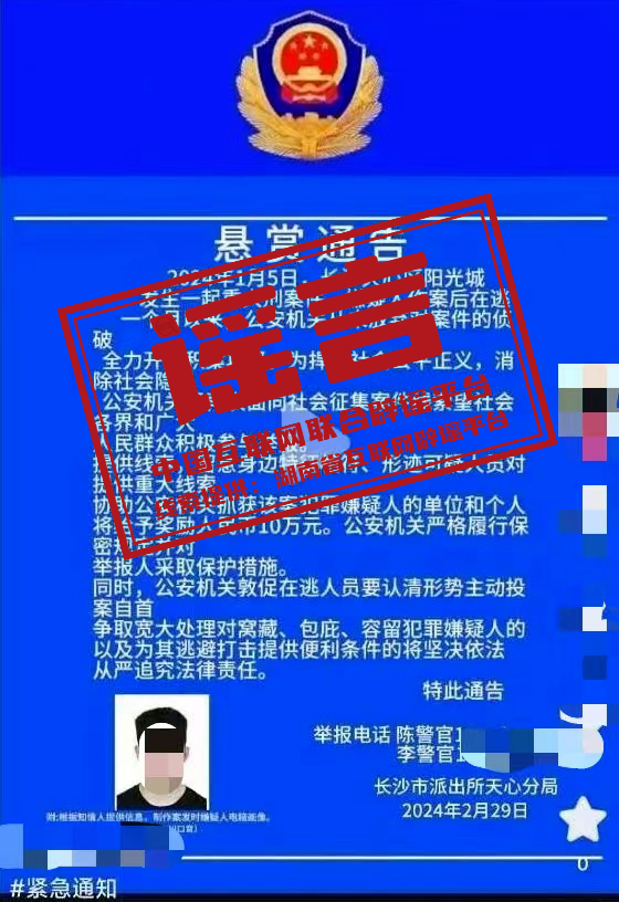 謠 言 湖南省長沙市天心區發生重大刑案,警方發布懸賞通告?