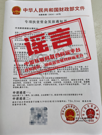 真相:近日,湖南一居民收到不明快遞,內(nèi)有一封以“國家金融監(jiān)督管理總局”和“中華人民共和國財政部”名義發(fā)布的《專項扶貧資金發(fā)放通知書》。該文件稱“中央財政將在今年四季度增發(fā)扶貧資金10000億元,凡收到本文件的人民群眾,有資格通過QQ掃碼進入群聊,聯(lián)系在線客服,或登錄‘中扶在線’平臺聯(lián)系客服,申請300萬扶貧資金”。